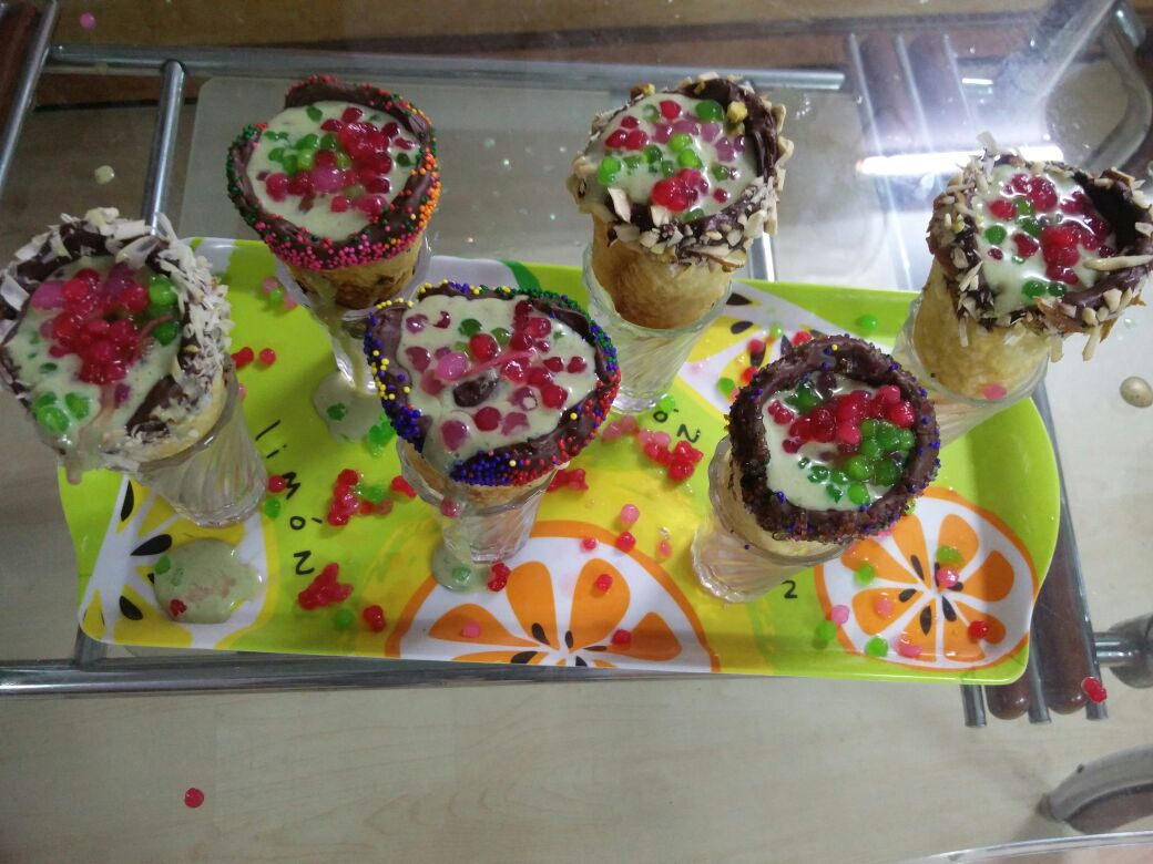 - Now take cones & dip the top surface of the cone into the melted chocolate then dip in dry fruit powder and keep it in fridge for 10-15 minutes to set.