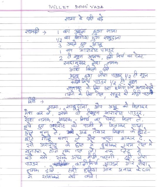 by: JAYSHREE VERMA city: INDORE in Alpahar little millets - (भागार ) MILLET DAHI VADA 32 / 60 Rating Cooking Time: 1.30-2 hour Ready In: 1.30-2 hour INGREDIENTS File Attached Procedure: File Attached Notes: Files: PREVIOUS NEXT